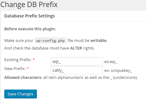 How? Once installed and activated, go to Settings > Change DB Prefix and set the new prefix to anything with numbers or letters other than wp_. Here we’ve changed the prefix on all tables to catly_